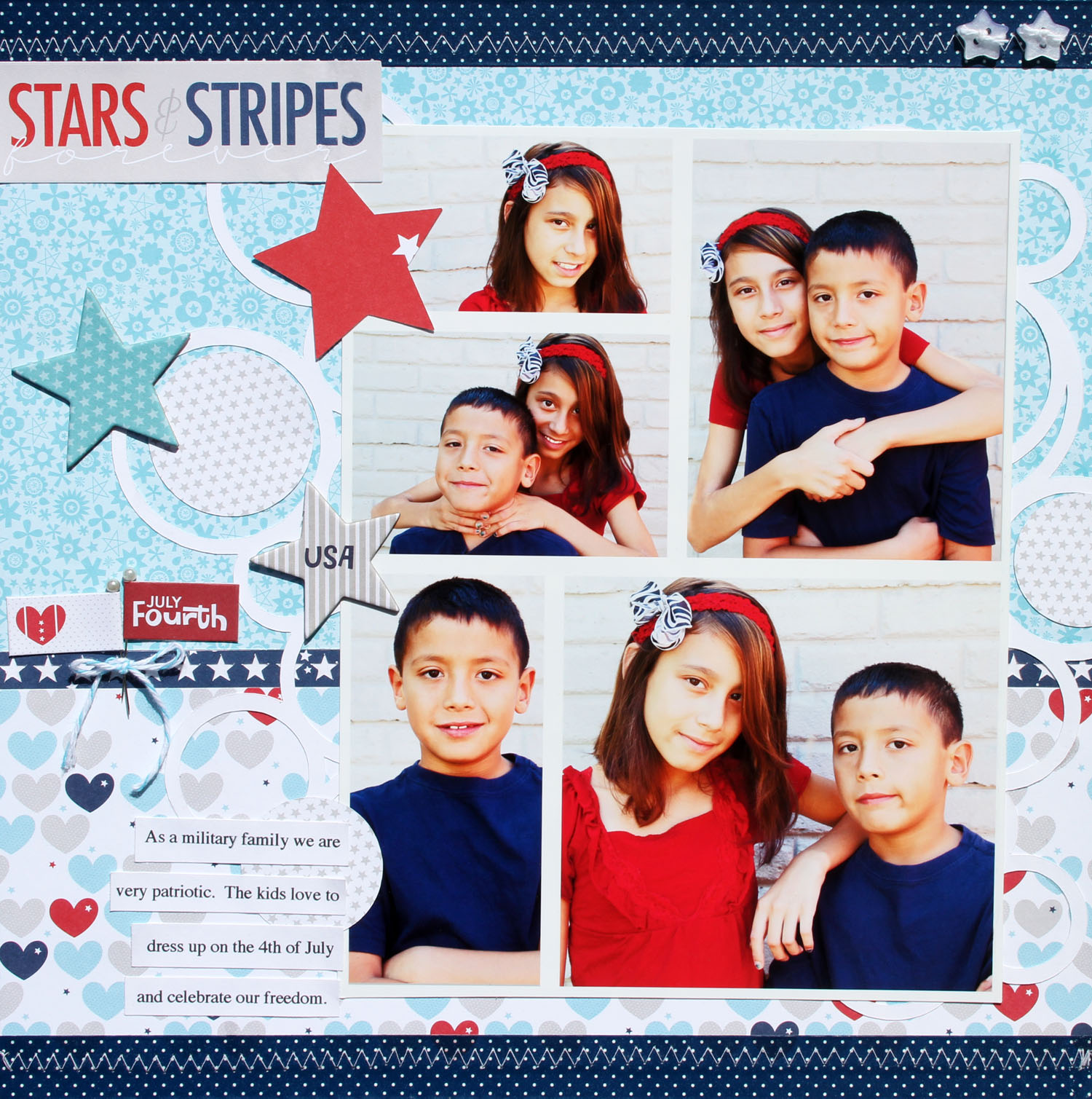 Bella's new All American collection helped bring my fourth of July layout to life. I love the playful patterns in this collection, they were perfect for these photos that I took of my kids dressed up on fourth of July.